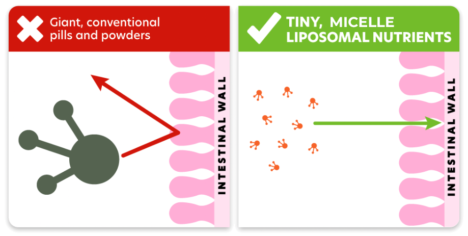 Micelle liposomal delivery is a technology that wraps each nutrient in a protective bubble, helping shield it from the harsh environment of your digestive tract. That way, more of the nutrients make it to your bloodstream where they can actually benefit your body. This results in superior absorption compared to standard capsules or powders.